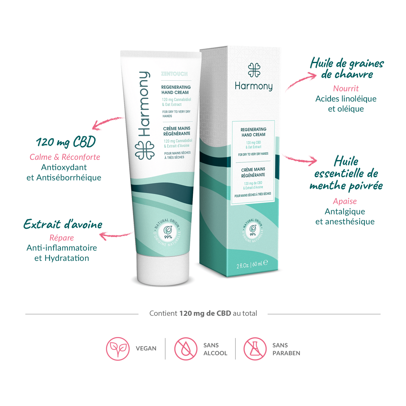 La Crème Mains – Zentouch – Harmony est formulée avec 99 % d'ingrédients d'origine naturelle, sans THC, sans parabènes, sans alcool, sans gluten, et non testée sur les animaux. Elle est également vegan et certifiée en laboratoire GMP.