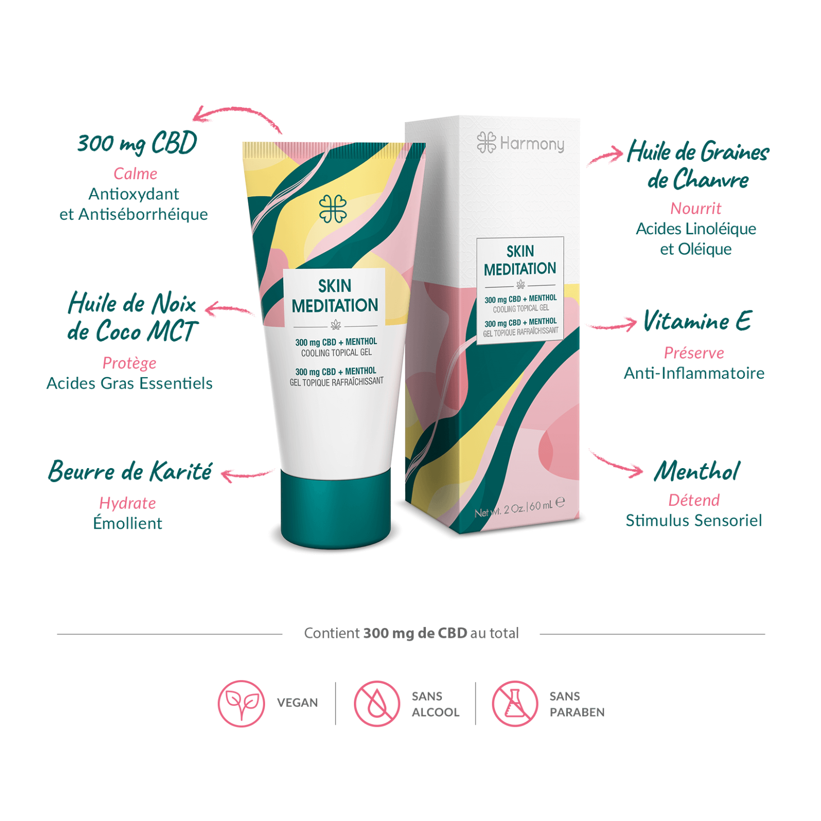 Ce gel est formulé avec 99 % d'ingrédients d'origine naturelle, sans THC, sans parabènes, sans alcool, sans gluten, et non testé sur les animaux. Il est également vegan et certifié en laboratoire GMP.
